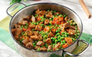 Μοσχάρι μαγειρευτό με αρακά και δυόσμο.