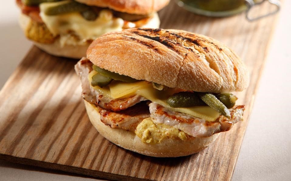 Μπέργκερ με χοιρινά μπριζολάκια, μουστάρδα και αγγουράκι τουρσί.