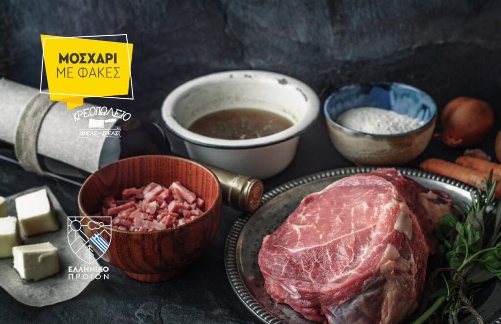 • 700 γρ. μοσχαράκι απο το κρεοπωλείο Κρέας Κρέας , κατά προτίμηση σπάλα, κομμένο σε κύβους περίπου 3 – 4 εκ.