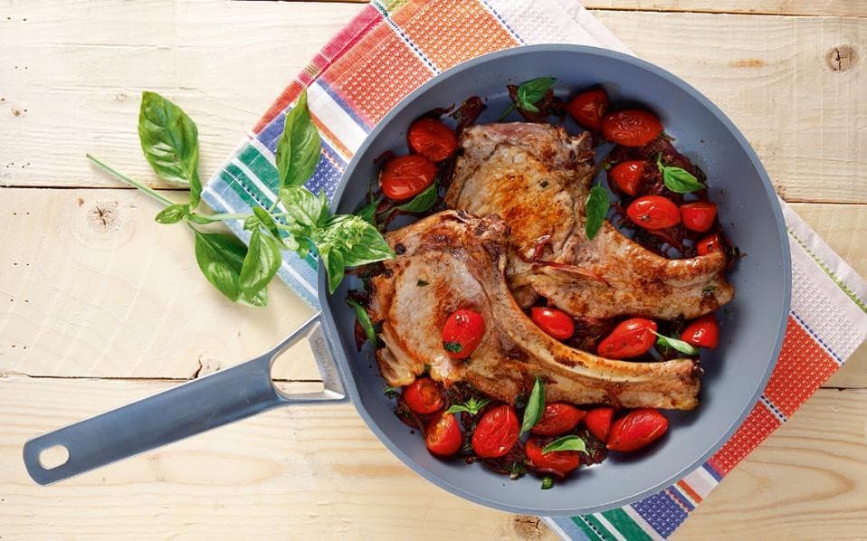 Μπριζόλες µε ντοµατίνια και βαλσαµικό.