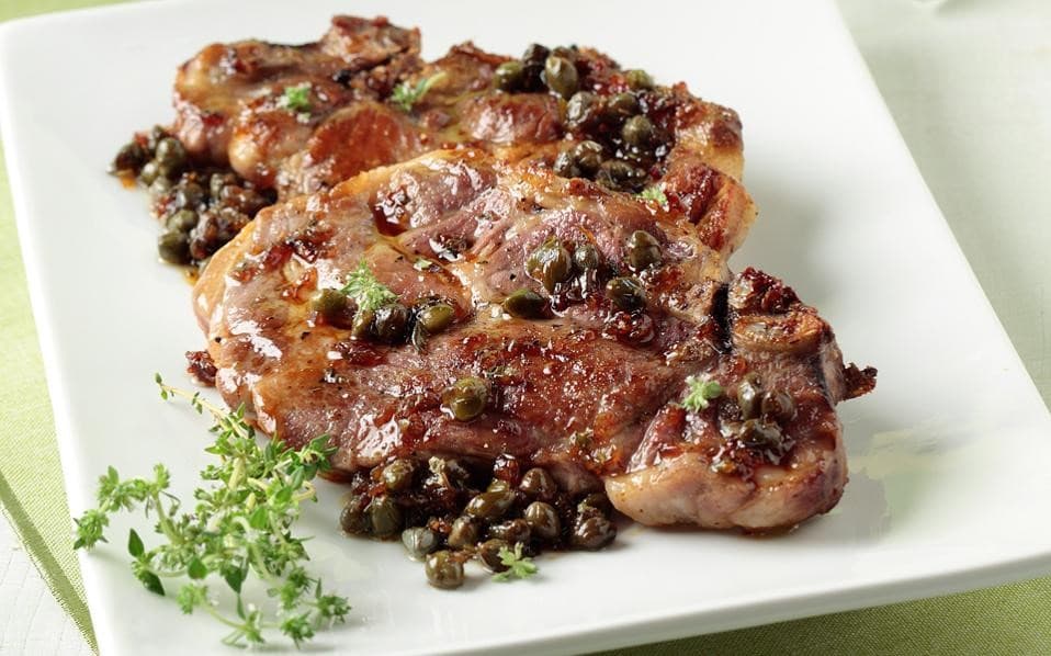 Χοιρινή μπριζόλα με σάλτσα από κάππαρη και μέλι.